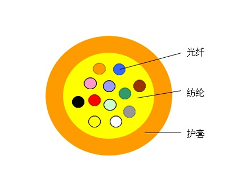 室内多芯微型光缆使用多根着色光纤作为光传输介质,外覆一层芳纶作为受力加强单元,最外挤制一层扁平聚氯乙烯(PVC)或低烟无卤材料(LSZH,低烟、无卤、阻燃)护套而成。