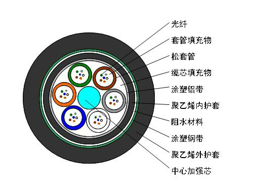 GYTA53光缆的结构是将250µm光纤套入高模量材料制成的松套管中,松套管内填充防水化合物。缆芯的中心是一根金属加强芯,对于某些芯数的光缆来说,金属加强芯外还需挤上一层聚乙烯(PE)。松套管(和填充绳)围绕中心加强芯绞合成紧凑和圆形的缆芯,缆芯内的缝隙充以阻水填充物。涂塑铝带(APL)纵包后挤一层聚乙烯内护套,双面涂塑钢带(PSP)纵包后挤制聚乙烯护套成缆。