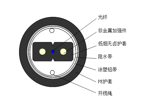接入网用蝶形引入室内光缆是将光通信单元处于中心,两侧放置两根平行非金属加强元件(FRP),挤制黑色低烟无卤护套。外包铝带防潮层,最后挤制PE护套成缆。