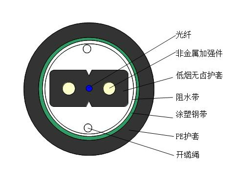 接入网用蝶形引入室内光缆是将光通信单元处于中心,两侧放置两根平行非金属加强元件(FRP),挤制黑色低烟无卤护套。外包钢带防潮层,最后挤制PE护套成缆。