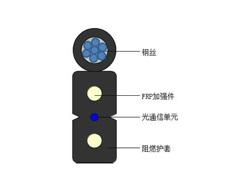 自承式接入网用蝶形引入室内光缆是将光通信单元处于中心,两侧放置两根平行非金属加强元件(FRP),在外侧再附加一根钢丝加强元件,最后,挤制黑色或彩色低烟无卤护套成缆。